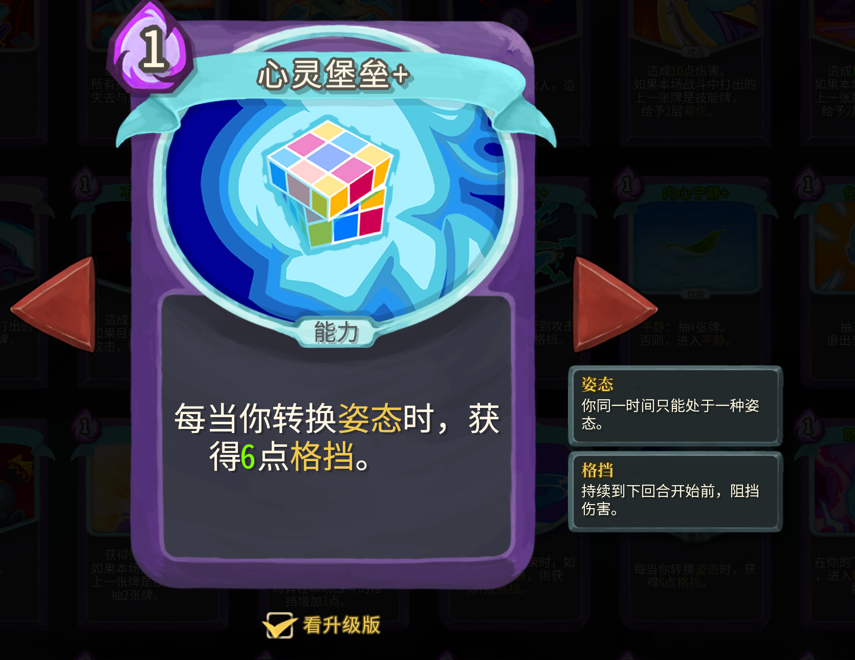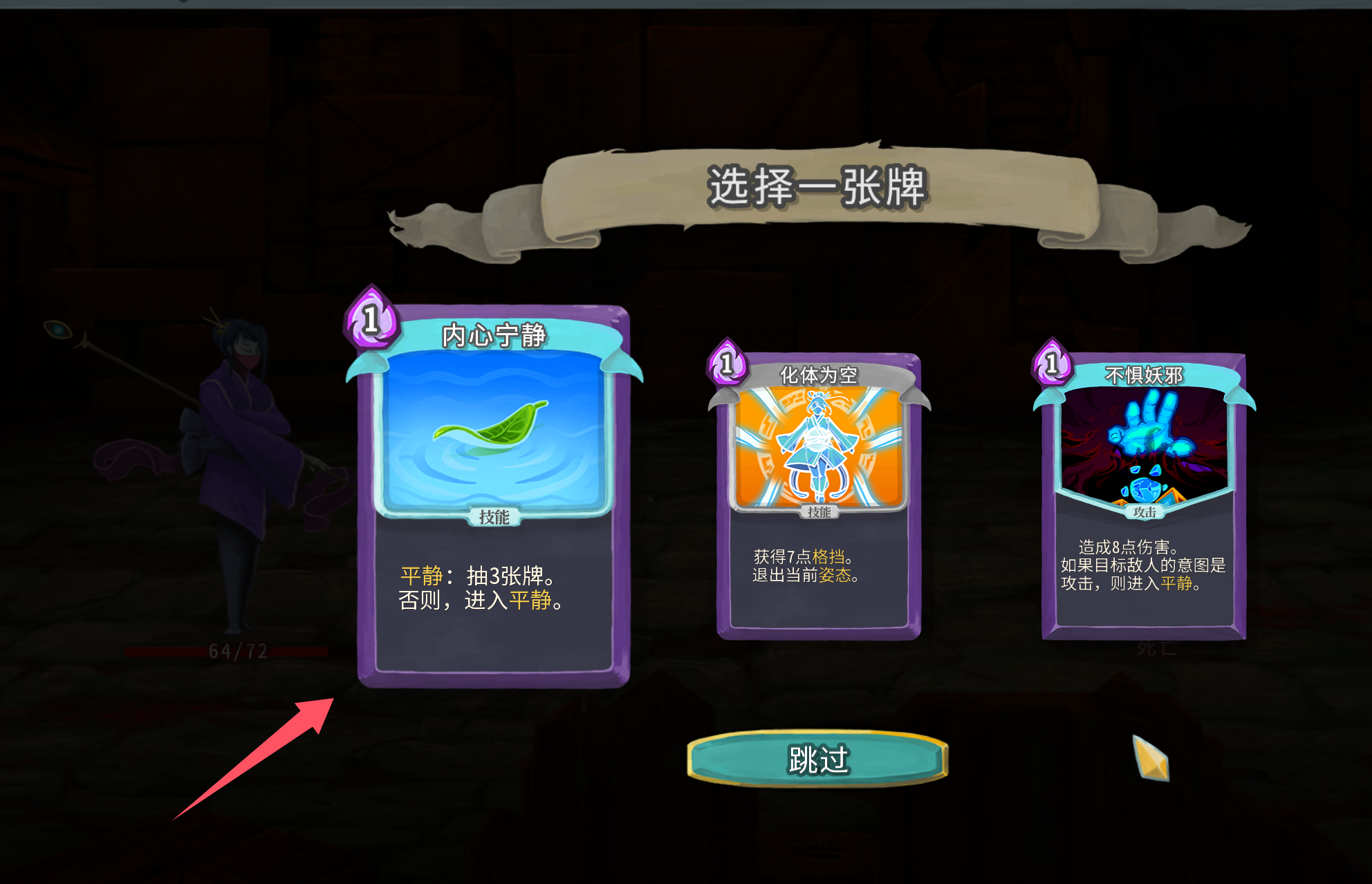 这个流派生存方面推荐拿以手拒之、心灵堡垒和当头棒喝,我们这个流派会频繁切换形态,心灵堡垒契合度相当高,又是能力卡,对循环影响很小,优先级最高。