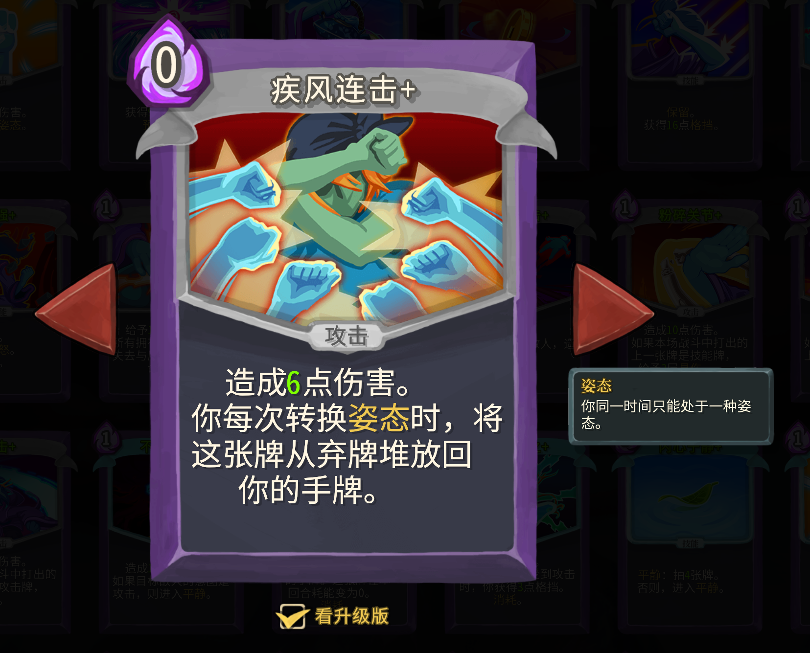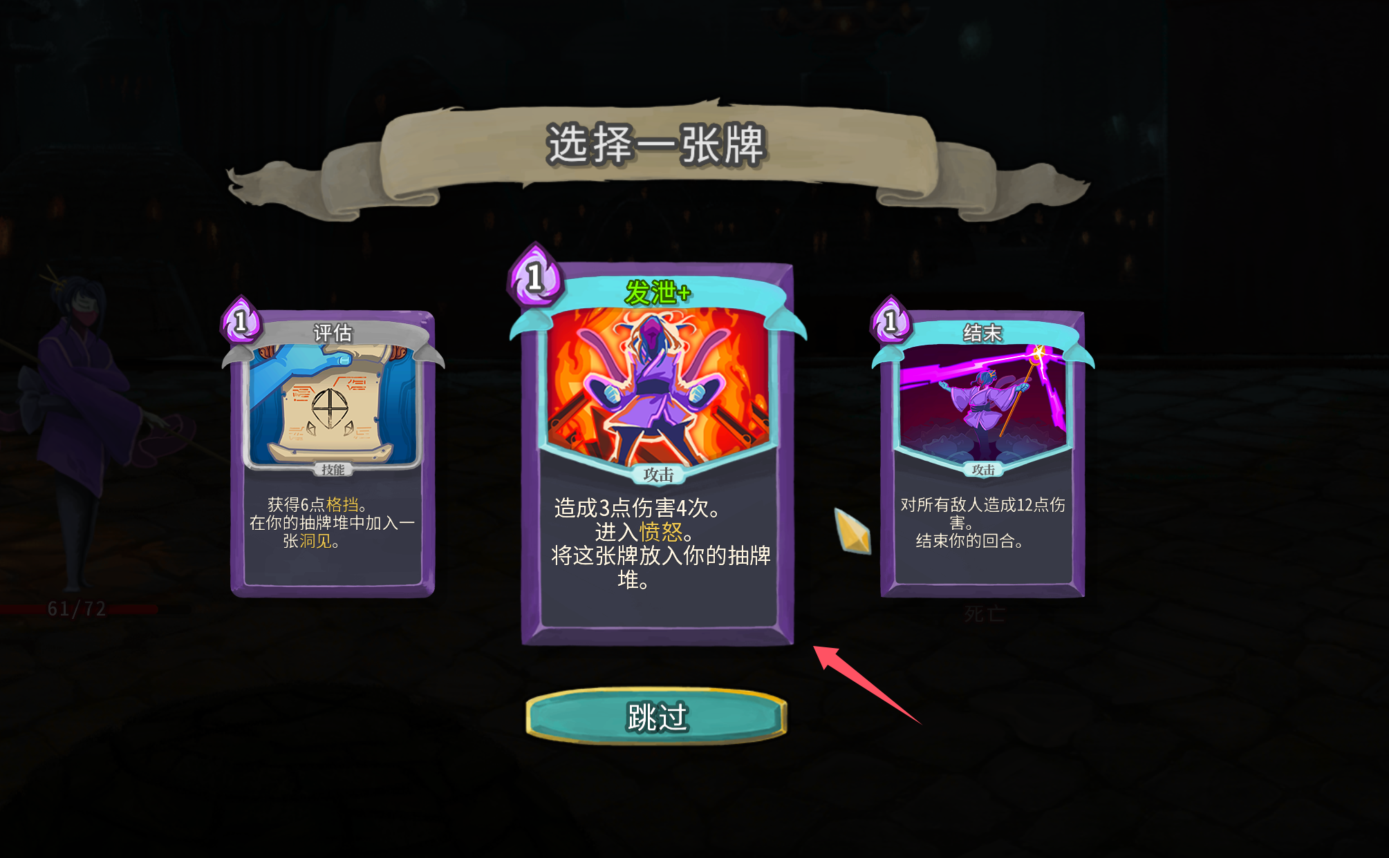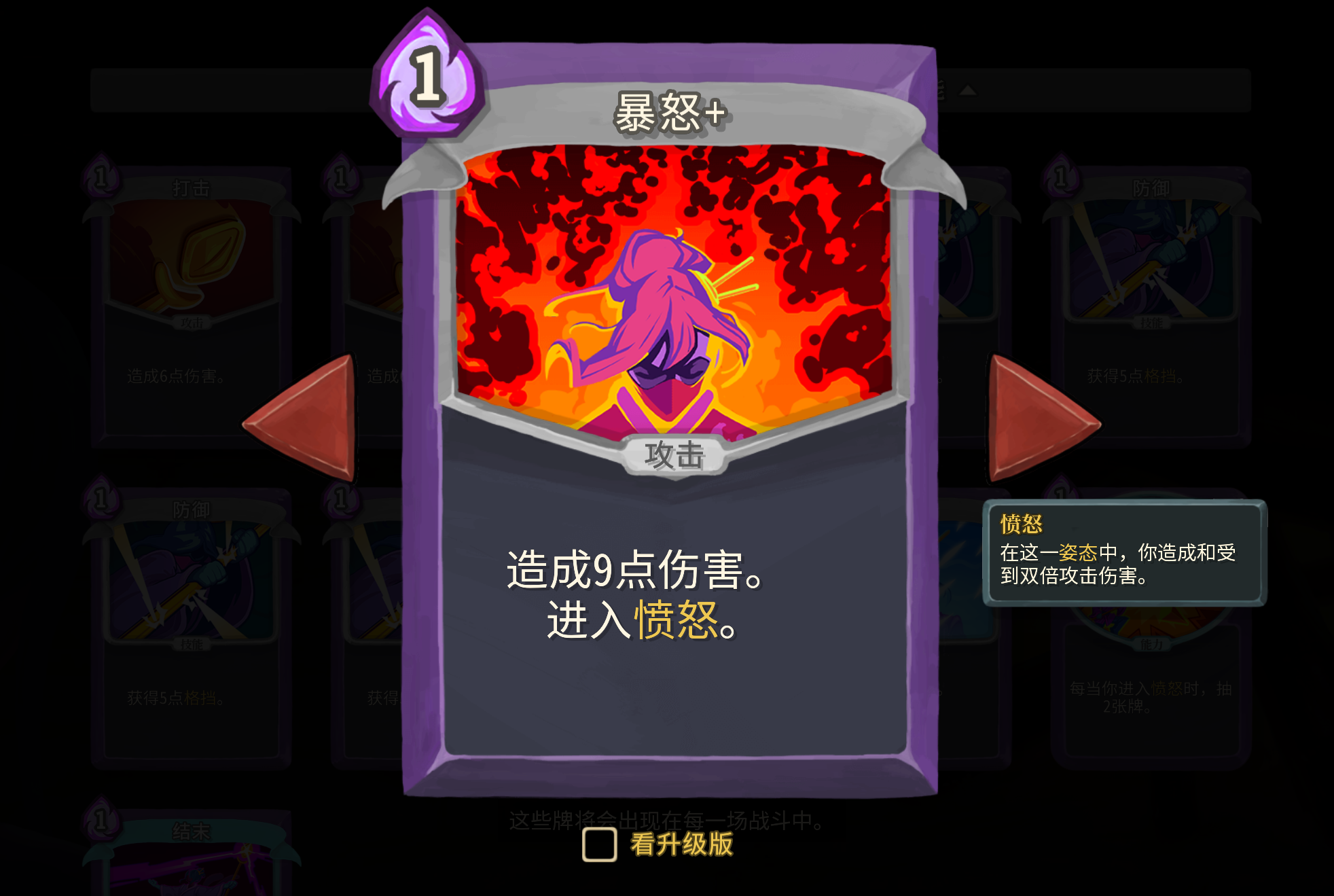 愤怒卡基本都可以拿,暴怒、发泄和义愤填膺都很适合这个流派,这里小二并不推荐拿两张以上的渐强,只有在发牌员实在不给其他愤怒姿态卡的时候才考虑。暴怒拿到之后记得早点去升级,两费和一费差距真的很大。