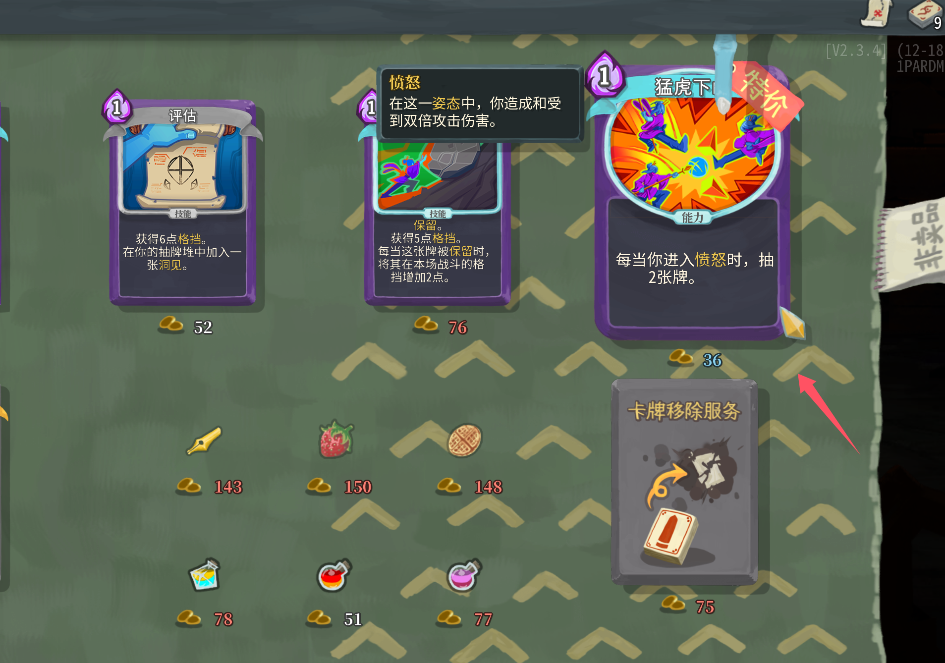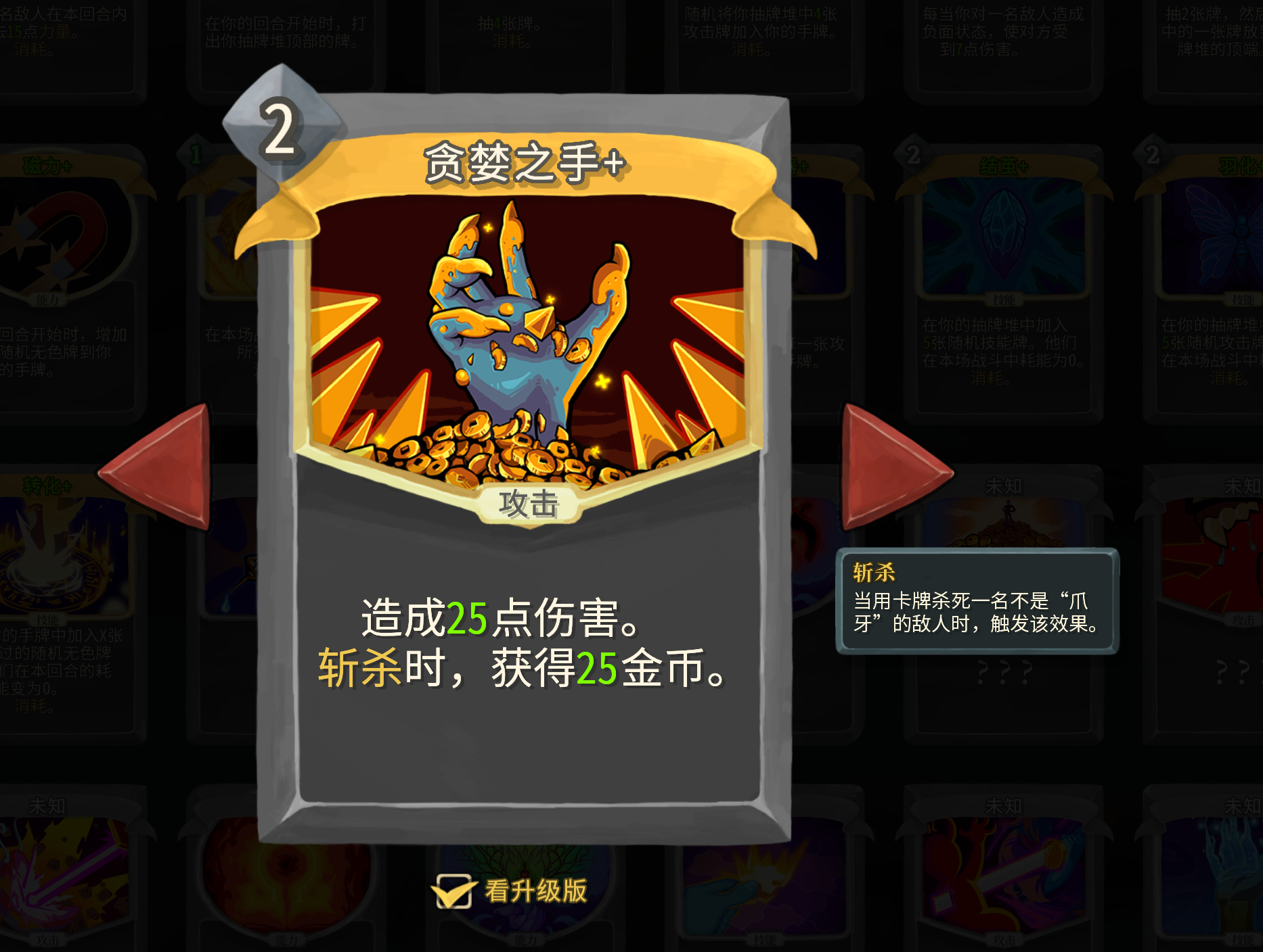 无色卡里面小二推荐可以拿一张贪婪之手,观者愤怒状态很容易打出斩杀效果,拿一张一般都是赚的,还能补充金币帮助我们删牌和购买关键卡。