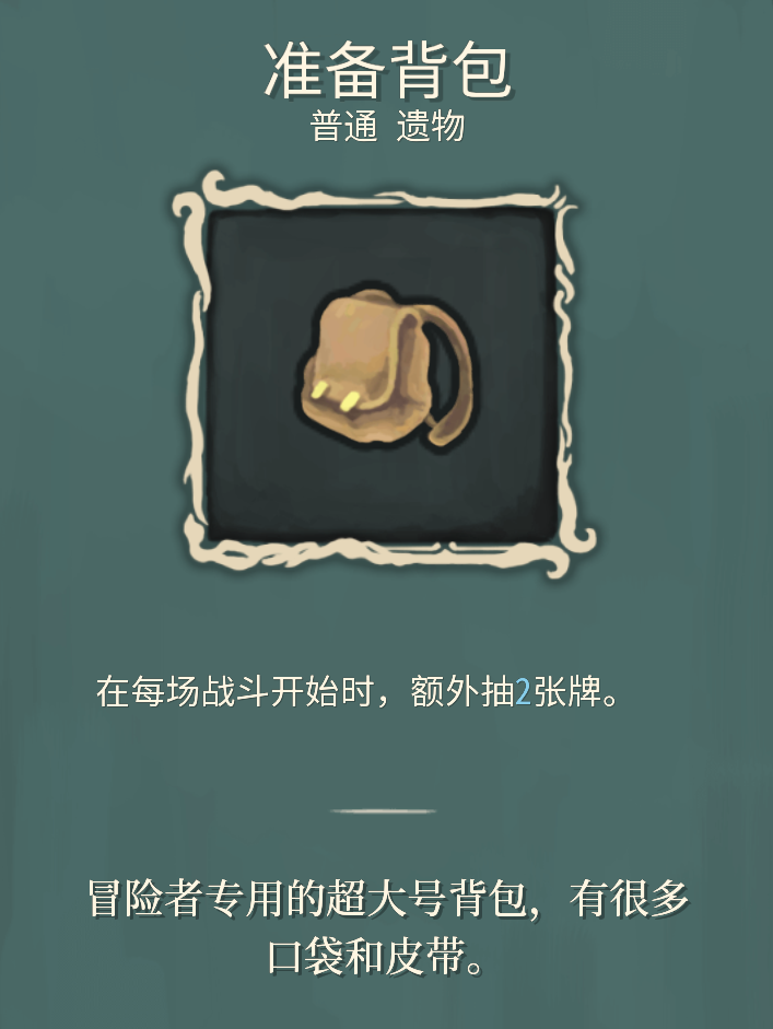 准备背包:观者能力本身有奇迹,拿一张准备背包可以在每场战斗开始前额外抽两张牌,两者契合度很高,能够加快启动速度,减少鬼抽概率。