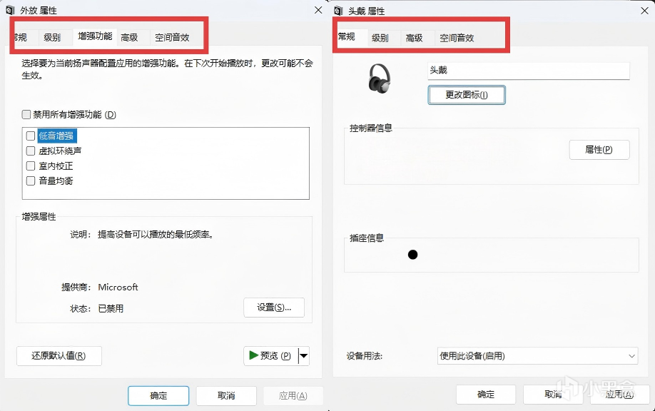 首先是第一个问题:“为什么的设备没有声音增强功能?”。系统中的声音增强功能取决于硬件是否支持,比如下图我的两个设备,其中一个支持声音增强就可以勾选“低音增强”,而另外一个不支持就不会出现选项。进入“声音设置”>“更多声音设置”>找到自己的输出设备>点击右键>选择“属性”即 可查看,具体操作步骤可看之前的文章。