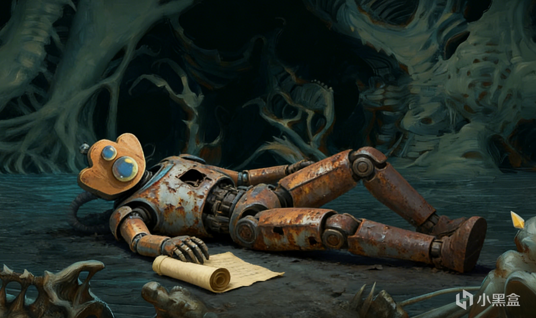 未来某日,一考古学家在对一座废弃的尖塔进行探索时,在一层的一个火堆旁边,发现一堆生锈的零件,经过分析,这可能是古代的某种机器人。