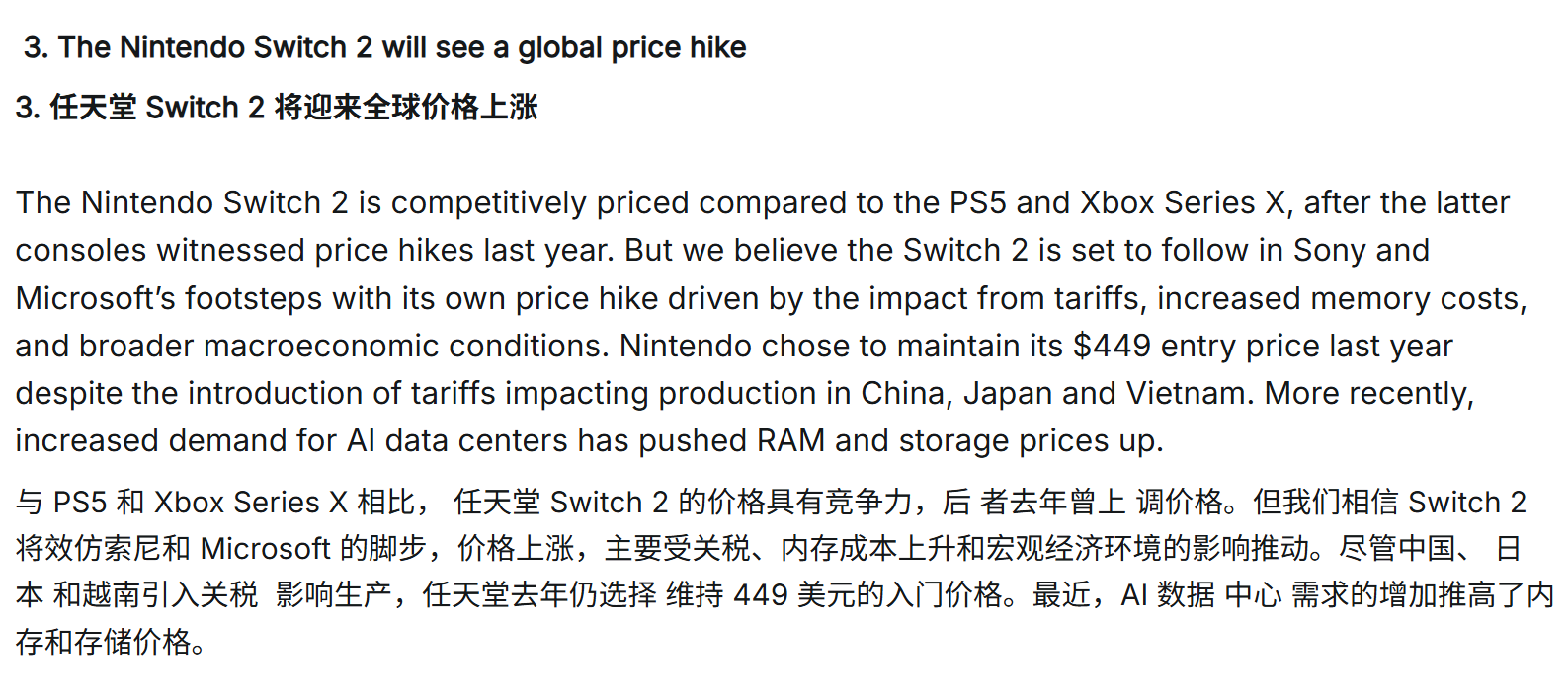 報告特別指出,Niko認爲購買任天堂Switch 2的最佳時機是:當下,即在任天堂對這款新型混合設備實施"全球價格上漲"之前。據該研究機構分析,2026年內某個時間點,"關稅上漲、內存成本增加以及更廣泛的宏觀經濟環境"等因素的綜合壓力將推動該主機全球售價上漲,任天堂將追隨索尼與微軟的腳步。
