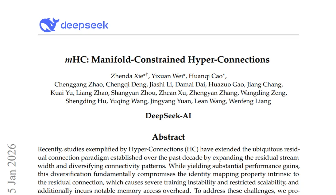 一项是 mHC(Manifold-Constrained Hyper-Connections)。这项工作试图在不显著增加计算和内存开销的前提下,扩展残差流的“宽度”,让模型在更深层仍然保持稳定训练。从实验结果来看,它确实能在较小代价下带来性能提升,也非常适合大模型和稀疏结构。