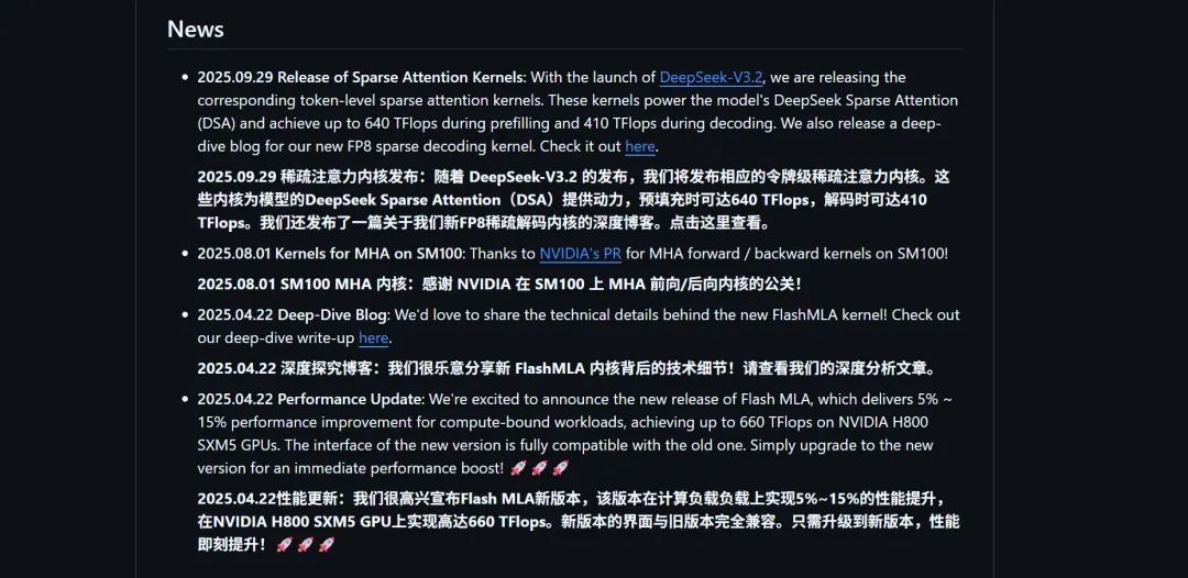 MODEL1 被集中发现于 DeepSeek 的 FlashMLA 仓库。这个仓库专注于注意力内核的底层优化,目标是让 V3 系列在 H800 等 GPU 上跑得更快、更省内存。