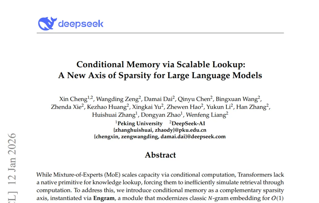 另一项是 Engram 记忆模块。它的思路是把一些可复用的静态模式,用类似哈希 N-gram 的方式缓存下来,实现近乎 O(1) 的访问,把负担从模型早期层移走。DeepSeek 在论文中已经把 Engram 明确描述为“下一代稀疏模型的基础组件”,这几乎是在明示它会被用进新模型。
