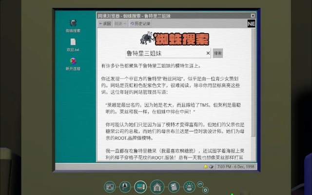 游戏发生在上世纪末,所以你只能用一些没那么先进的检索工具,但也足够强大。比如那个模仿谷歌的蜘蛛搜索,让你可以把各种关键词输入其中,狩猎线索。