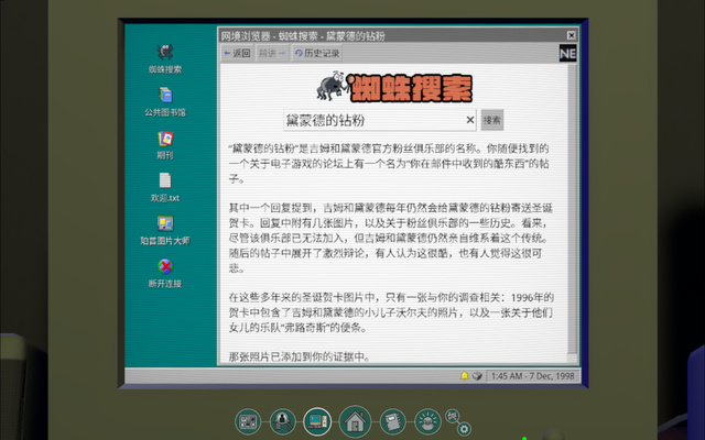 如蜘蛛网般复杂的信息检索,就是游戏乐趣之一。这些线索总是以巧妙的方式互相编织、结合,所以在信息之海里,慢慢寻找线索,绘制出故事的全貌,确实是个有趣的玩法。
