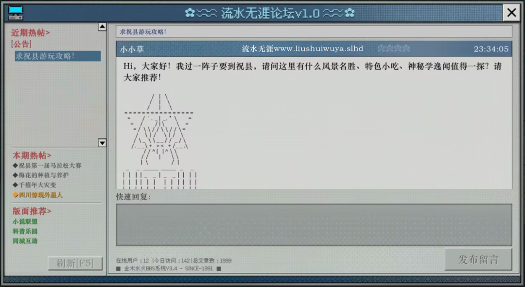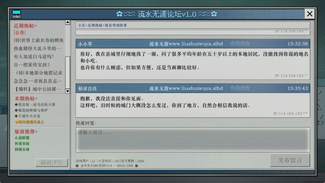 另外,在剧情小径中你会在论坛中刷到各种各样的讨论,从日常生活,到东方神秘术各种独特设定,其中有不少充满时代风味。包括最后,与鹭鸶剪一同脱离封印的程和光也是通过论坛重新亮相。