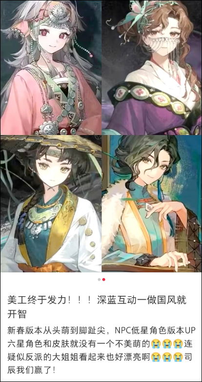 更亮眼的是,这次《1999》的国风美术再次升级。有人从封面图就感受到满满的武侠、仙侠味;有人拿出历年皮肤对比,发现每一年的春节皮肤都想买;还有不少人调侃“深蓝一做国风就开智”。