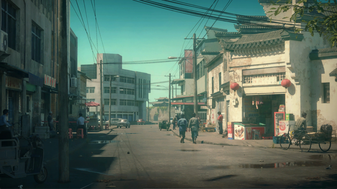 这是一个古今交错的时代。电线在头顶交错成网,把天空切成一格一格的蓝,灰砖旧瓦和新起的水泥楼彼此紧挨,老屋檐下还挂着红灯笼,冰柜还贴着鲜艳的窗花,街角那辆熟悉的二八大杠和三轮车歇在一旁,还没来得及被时间赶走。