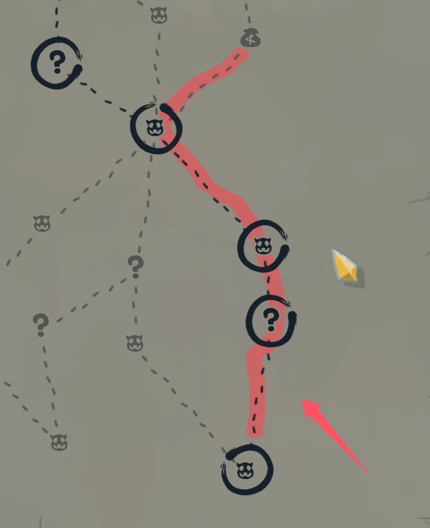 问号节点:事件/随机战斗,基础出怪概率10%,若没出怪,下一个问号的出怪概率增加10%(可利用这点“赌”事件收益)。举个例子路线上有两个问号,第一个不出怪的概率是90%,第二个不出怪的概率是80%,第三个70%,以此类推,根据概率学算连续不出怪的概率就是0.9×0.8×0.7×……。