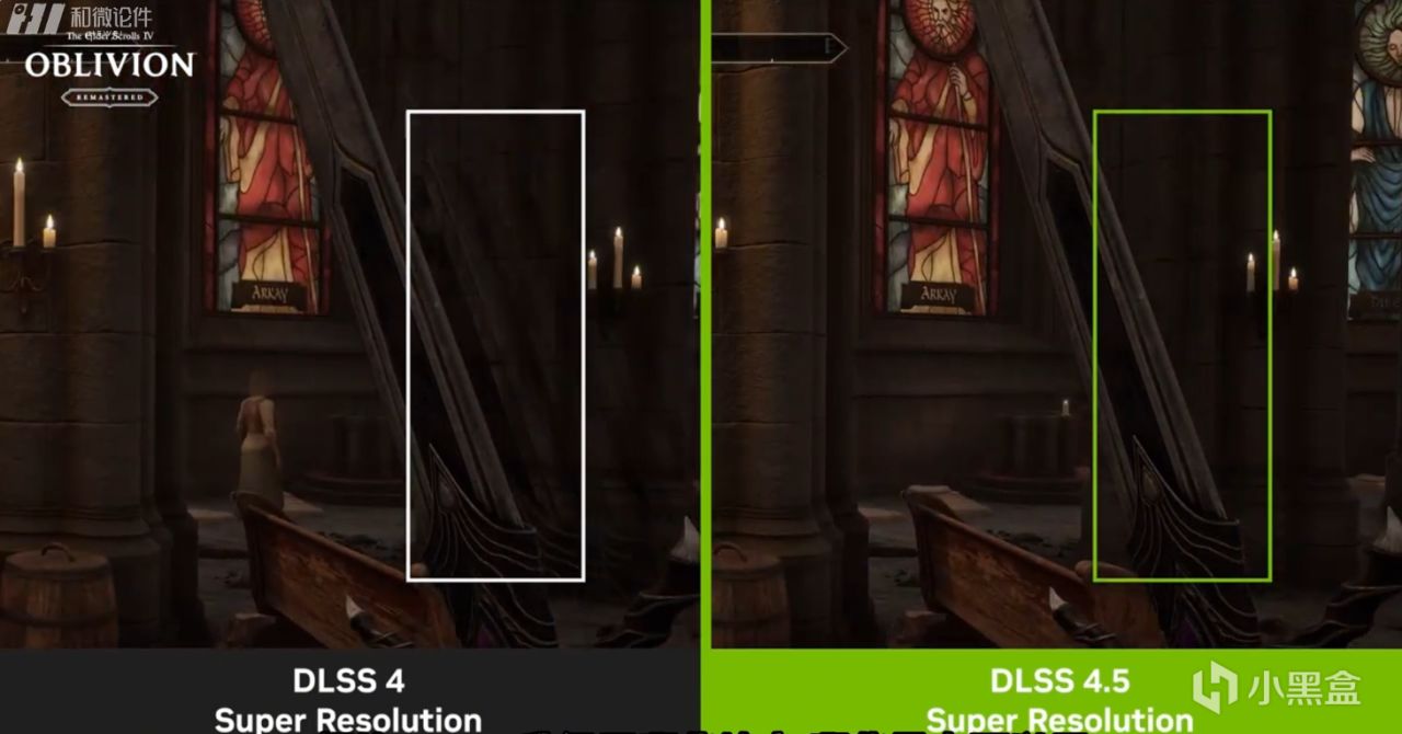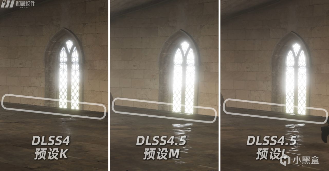 楼梯的边缘在K模型中锯齿状很明显,但是开启了DLSS4.5 M和L模型后,边缘变得非常平滑。教堂的蜡烛也明显增多。而且桌子上的瓷器也增加了光泽,地砖的纹理也变得更加细腻。