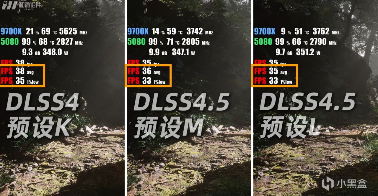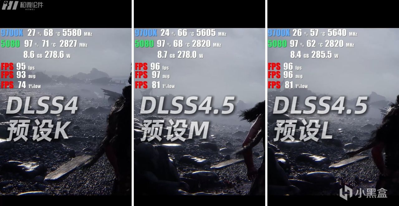 在地狱之刃2中,使用DLSS4 K模型的帧数最高,平均帧能来到53帧左右,而L模型的帧数最低,平均帧约为42帧左右,画质方面,模型L的整体颜色整体更暖,而M和K的模型的颜色更淡,而且脚下草丛的细节方面也是L模型更加自然。