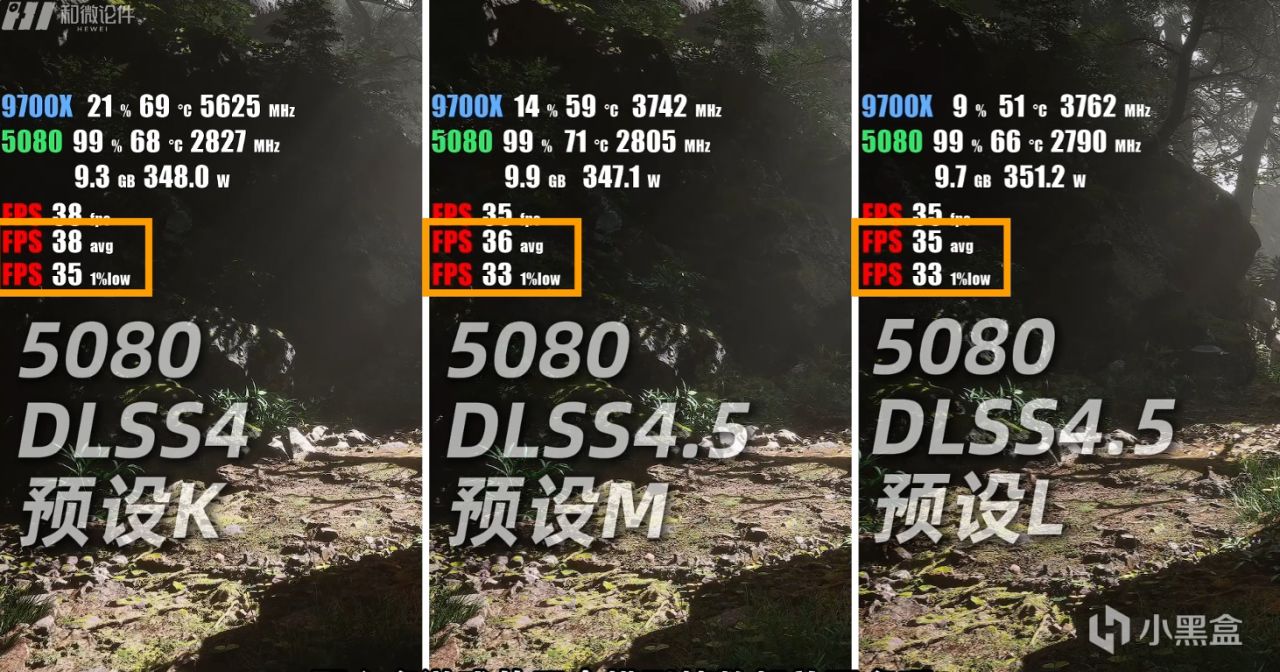 首先是在黑神话悟空这里,3个模型的帧数差距没有很大,DLSS4以及DLSS4.5都维持在36帧左右的表现,LOW帧也没有差异。画质部分DLSS4.5的L模型暗部细节更多,地面的纹理以及细节比M更强,M和K地面的纹理区别不大,但是盔甲和棍子上的细节上M做的更好。