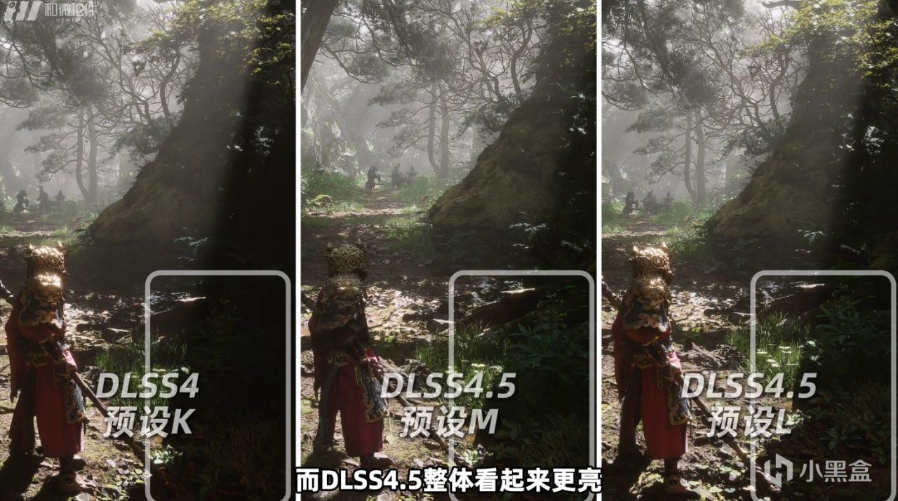 阴影部分DLSS4对比度比较高,而DLSS4.5整体看起来更亮,并且身上的盔甲、和棍子灯细节更突出,草丛的暗部细节更多。