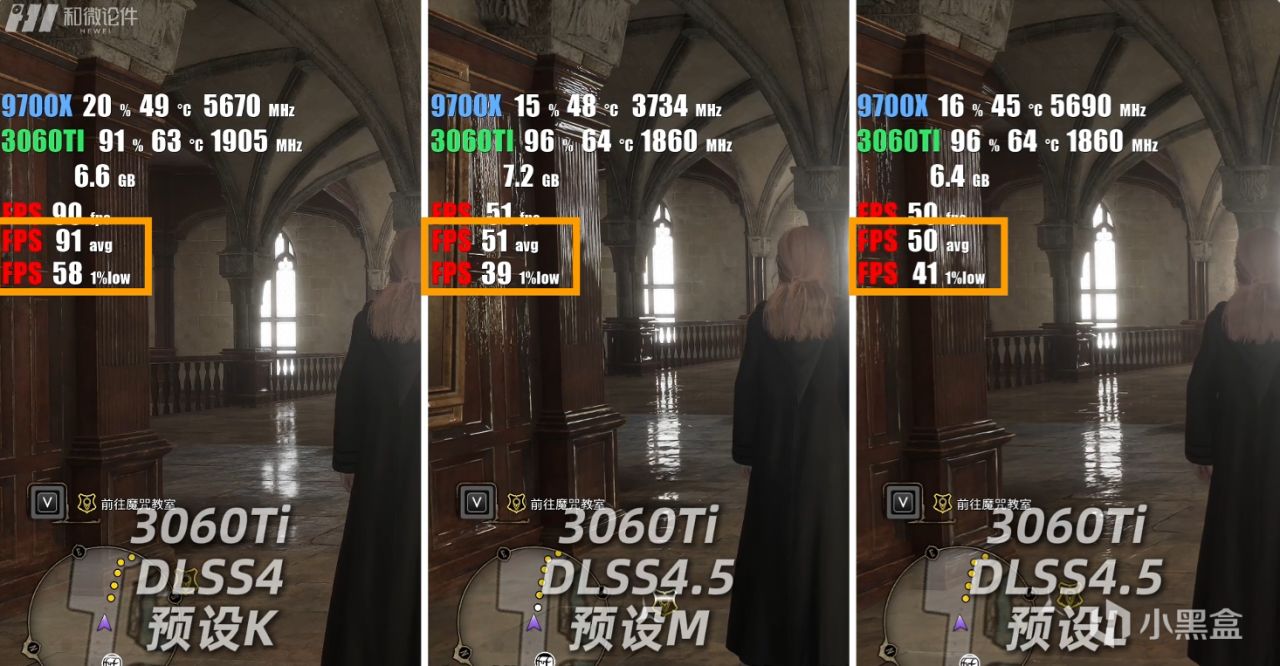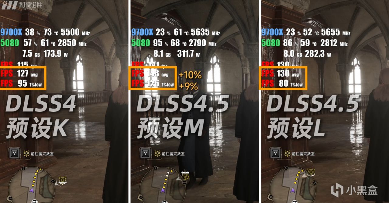 在霍格沃兹之遗中,也是本次实测过程中DLSS4以及DLSS4.5帧数差距最大的游戏,在开启DLSS4.5 M模型后,相比DLSS4的K模型平均帧提升了约10%,LOW帧也有9%左右的领先幅度。但是显卡占用这里,5080在开启DLSS4 K模型以及光追后来到了60%左右,而DLSS4.5 M模型可以直接来到95%左右,并且画面差距很大,窗户的地面反光变得更清晰,柜子纹理更多还增加了反光。注意,这不代表DLSS4.5相比DLSS4在提升画质的同时提升了帧数,而是显卡压力不同造成的帧数差距,我们重点关注画质即可。