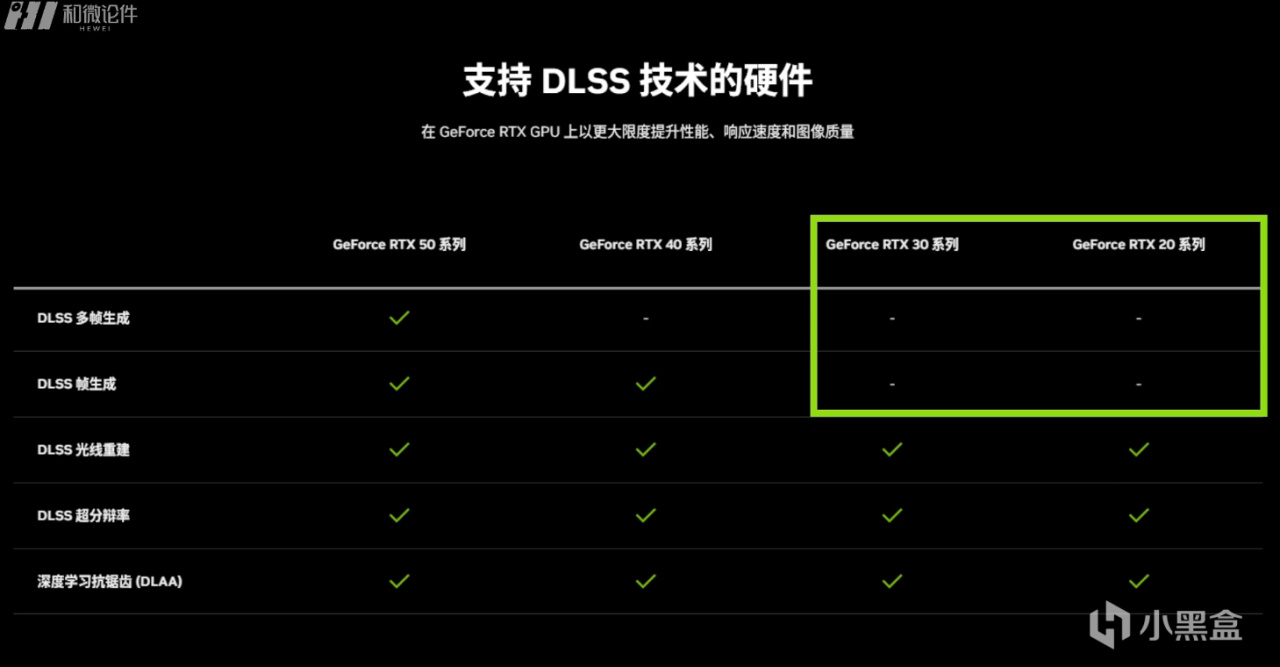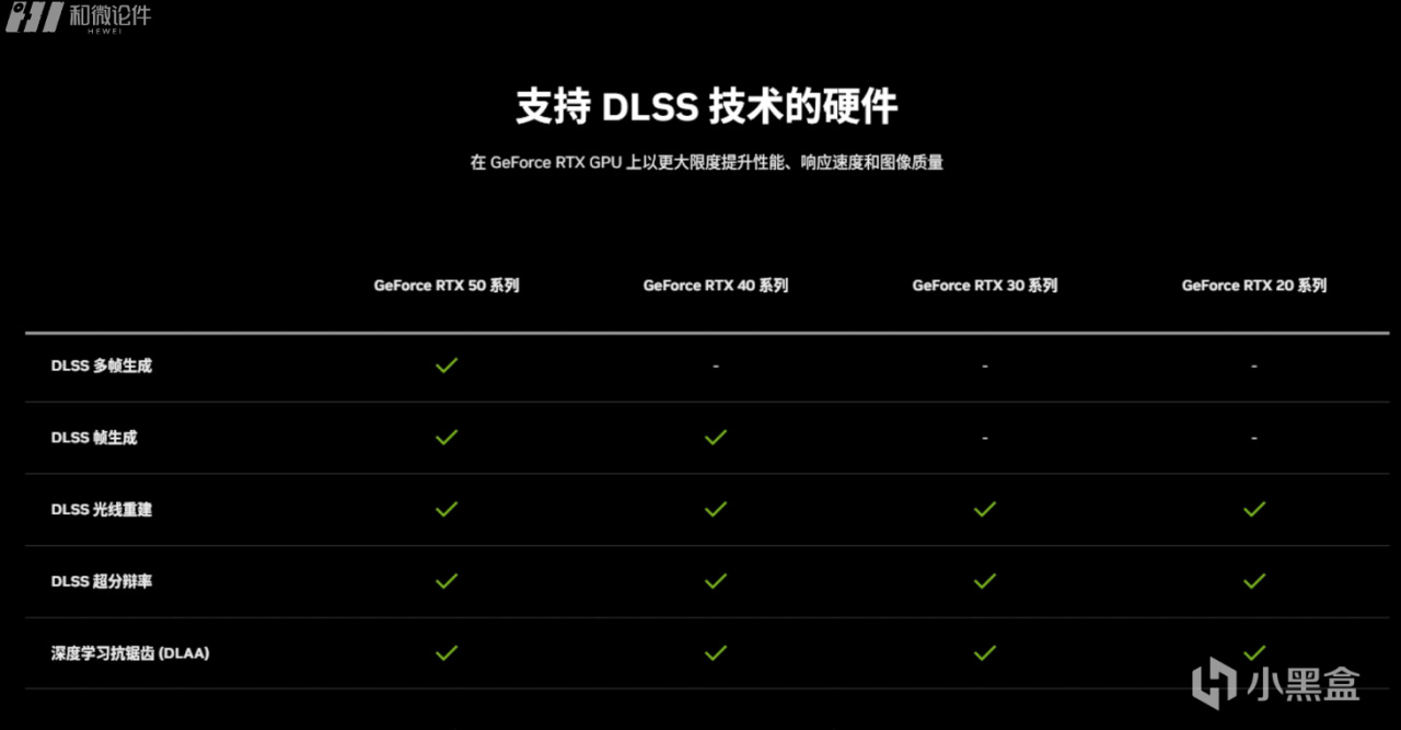 最后这个表是RTX 20-50系列显卡支持的DLSS功能对照,大家可以很直观的看出自己的显卡支持到DLSS中的哪几项功能。