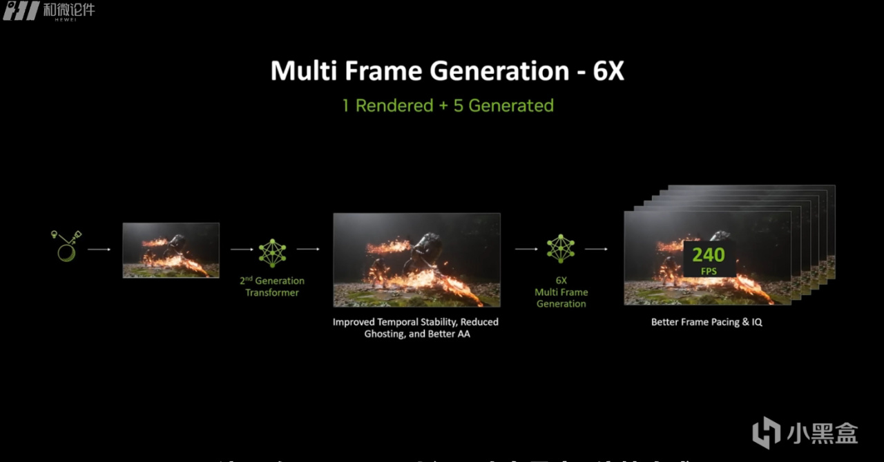 再到我们比较熟悉的DLSS 4,可以理解为帧生成的Pro 版本,支持最高4倍帧生成,目前50系独占,帧数提升非常夸张,老黄甚至在发布5070的时候宣称能够打败4090,仔细一看是配合4倍补帧,也基本可以入典了。DLSS4同时对画面流畅度和稳定性也做了优化,并且引入了第一代Transformer 模型,说简单点,又是一个提升画质的技术。