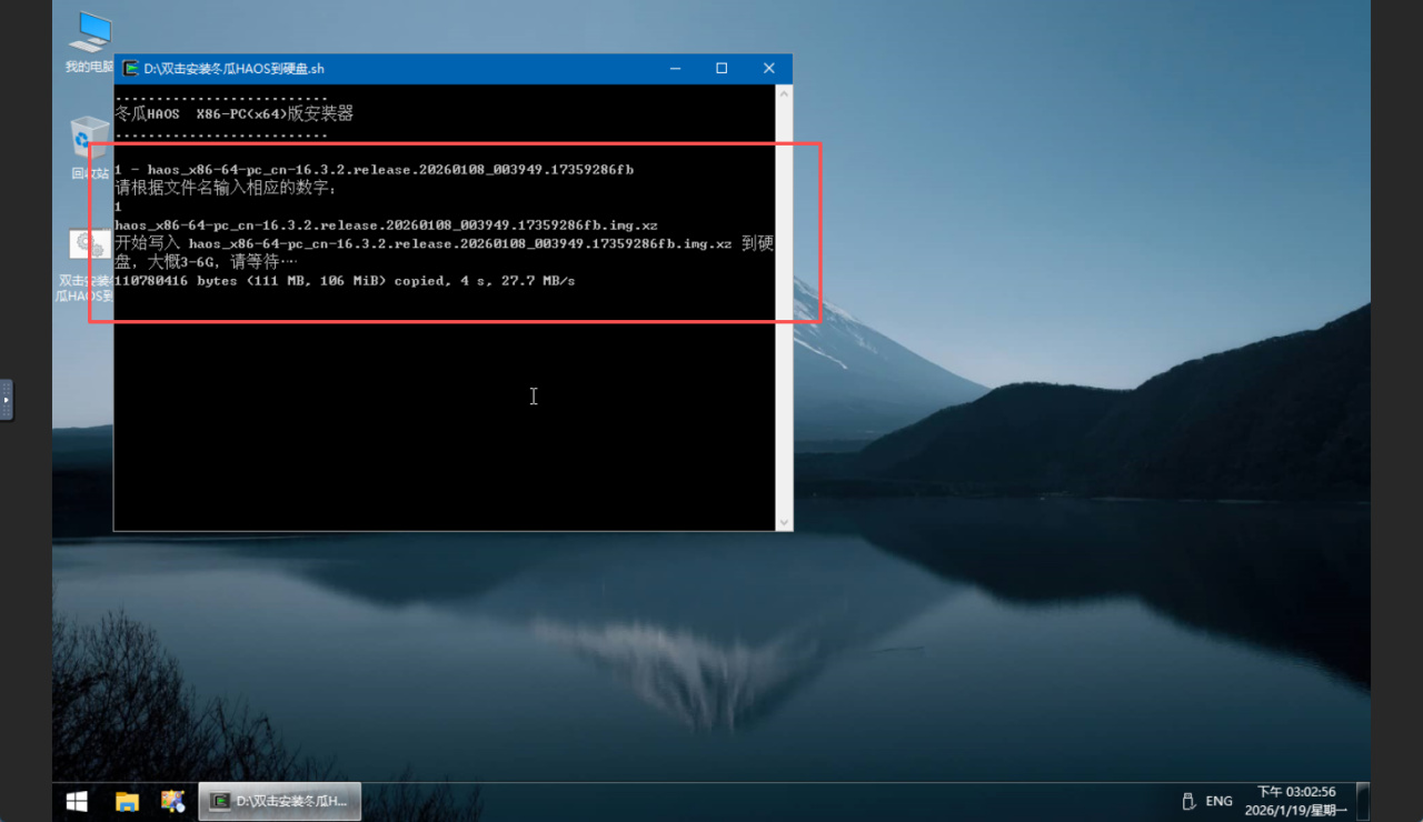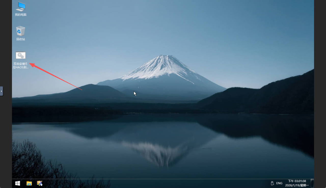 创建完成之后直接访问虚拟机,会通过VNC界面弹出Win10的桌面,在桌面有一个安装冬瓜HAOS到硬盘,点击即可。