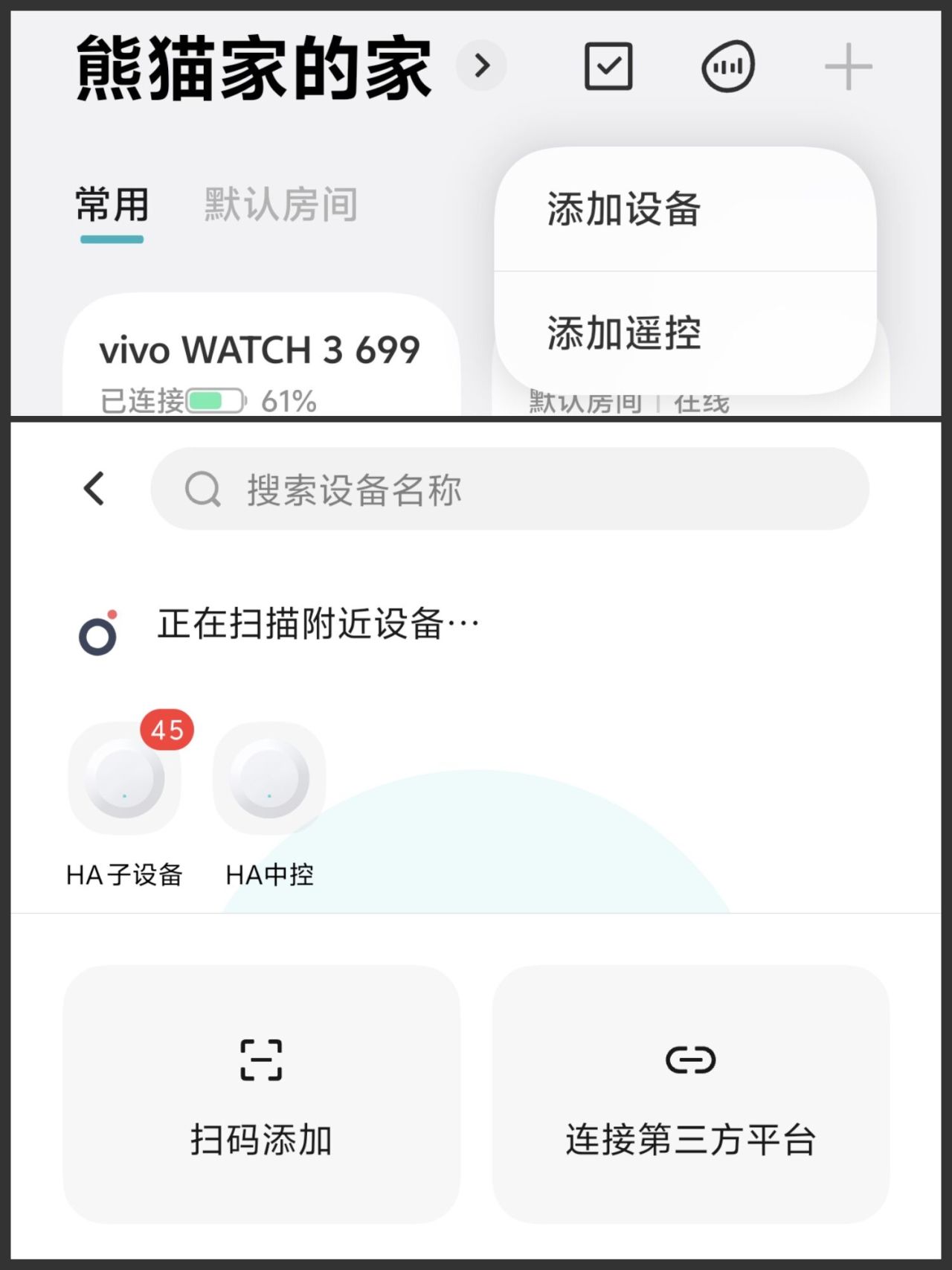 在APP首页点击右上角的“+”号,选择“添加设备”。此时APP会自动扫描局域网内的智能终端。你会看到“HA中控”和“HA子设备”两个选项。