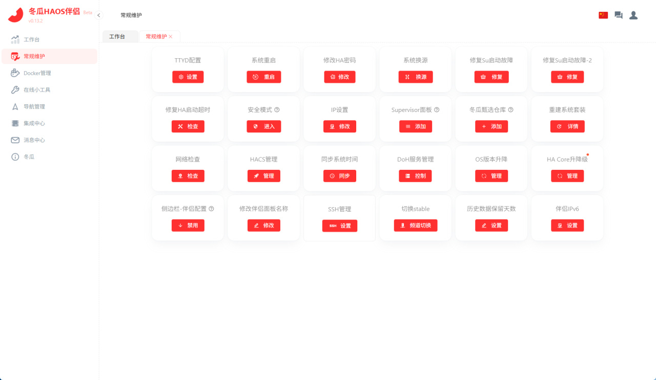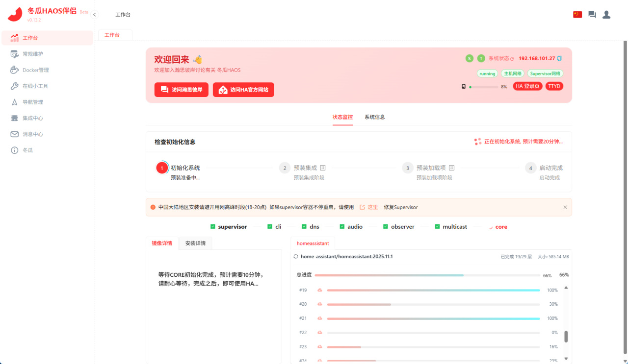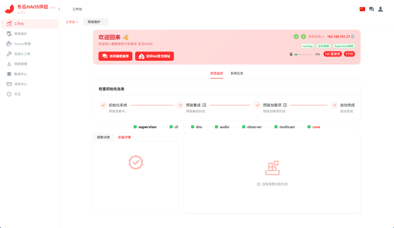 趁着系统在“自我组装”的这段空档,我们可以顺便参观一下冬瓜HAOS独有的管理后台。相比原生HA的简陋,这里集成了工作台、常规维护、Docker管理、在线工具以及非常实用的集成中心。这些功能极大地降低了后期维护的难度,具体细节熊猫就不在这里做说明书式的讲解了,建议大家搭建好后亲自点进去探索。