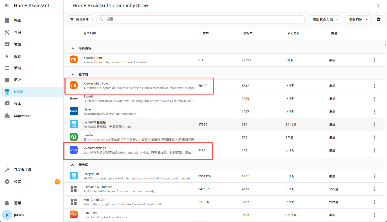 操作非常简单,通过浏览器访问IP:8123进入HA管理界面,点击侧边栏的HACS(第三方应用商店)。在这里搜索Vivo相关的集成组件并安装。