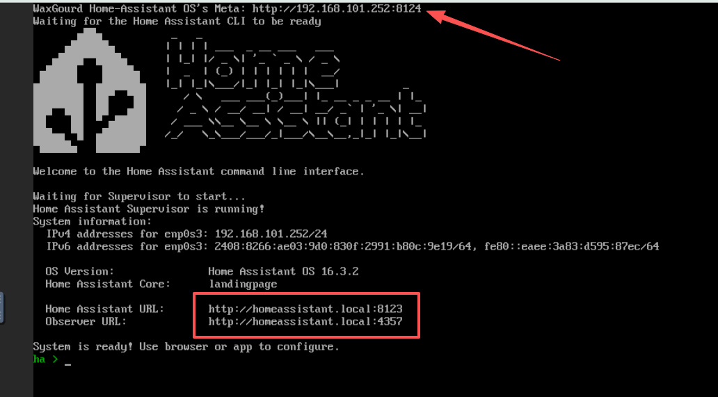 最后会出现这样的界面,这也就代表冬瓜HAOS已经安装成功了,在顶部能看到对应的IP与端口号,通过这个网址就能访问配置界面了。其中8124端口对应的为冬瓜HAOS系统,而8123则是HA的访问界面,也可以直接本地输入下方的网址访问。