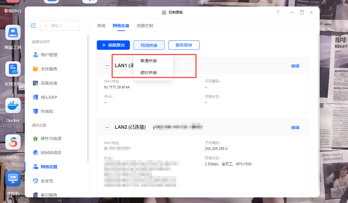 最后也既是最重要的网络,在网络设置前一定要检查绿联的网络模式为“桥接模式” (Bridge)。只有在桥接模式下,虚拟机的HA才能拥有一个和家里路由器同网段的独立IP地址(例如192.168.x.x),这是HA能够自动扫描并发现局域网内小米、HomeKit 设备的前提条件。
