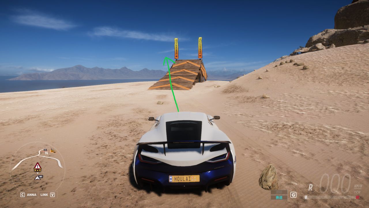建议找有辅助跳台的危险标志,斜着上跳台来让半侧车身悬空并下坠,即可空中完成翻转;