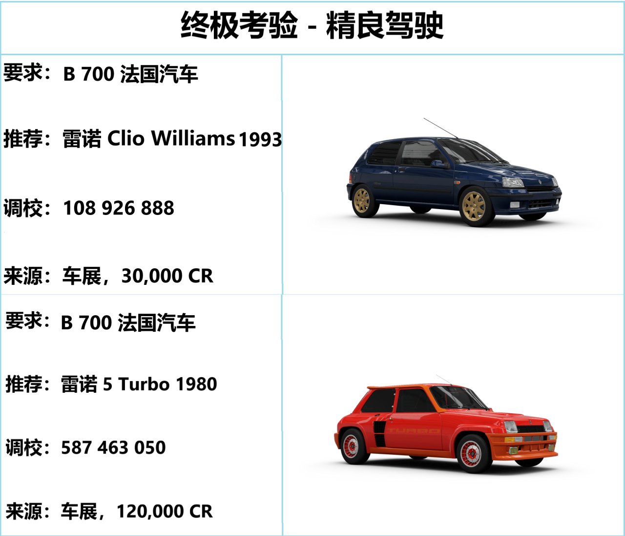 这个分段能用的法国车,基本就剩雷诺了。Williams 是原厂胎配涡轮机,启动、加速快但抓地力不够,过急弯容易侧滑;Turbo 是拿来跑拉力的,加速快但转向很硬。