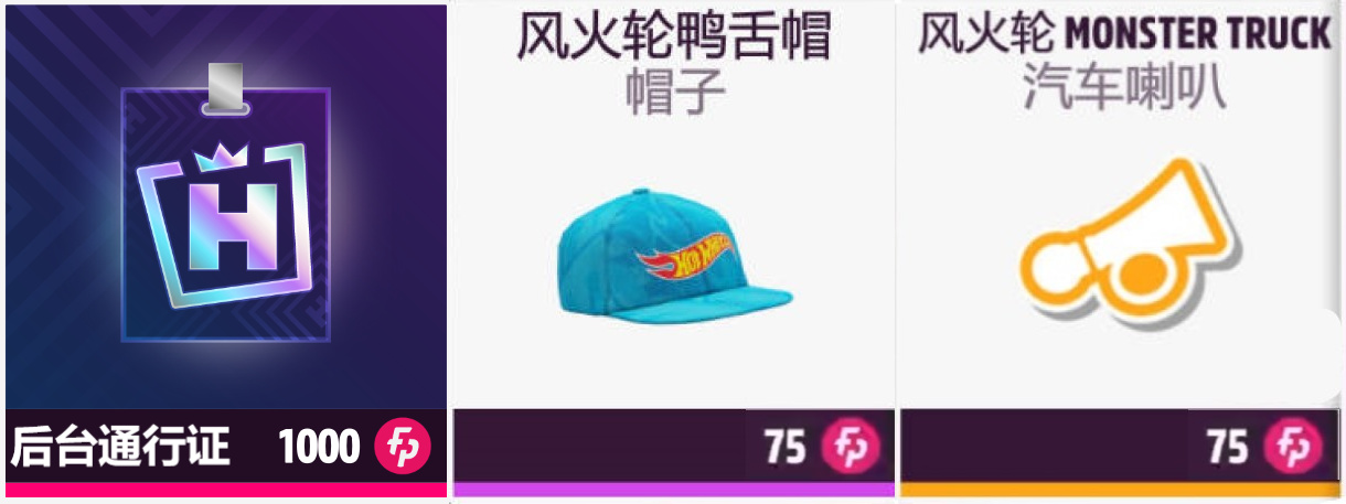 剩余物品:后台通行证、风火轮鸭舌帽、风火轮 MONSTER TRUCK