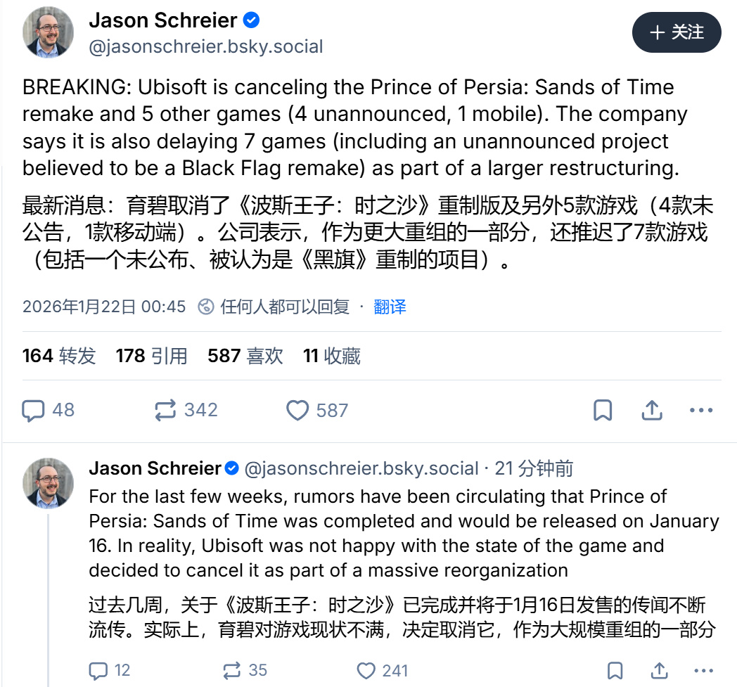 此消息首先由彭博社记者杰森·施赖尔披露,他表示:"突发新闻:育碧正取消《波斯王子:时之砂重制版》及其他五款游戏(四款未公布项目及一款手游)。公司同时宣布延期七款作品(包括一款据信为《黑旗重制版》的未公布项目),此为大规模重组计划组成部分。"施赖尔的报道指出,此次取消与延期行动是出版商重新规划产品线与生产优先级协调战略的一部分。