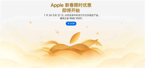 快科技1月22日消息,今日,苹果中国官网上线新春限时优惠活动页面,活动将于1月24日-27日开启。