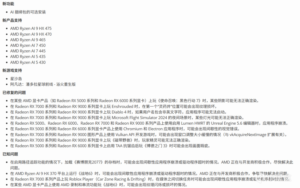 不过此版本仍存在部分已知问题:AMD 指出,《赛博朋克 2077》开启光线追踪路径追踪功能时可能出现间歇性崩溃或驱动超时;搭载锐龙 AI 9 HX 370 的设备运行《战地风云 6》时会存在稳定性问题;RX 7000 系列显卡运行《Roblox Player》客户端切换任务时可能崩溃;《战地风云 6》开启录制与串流功能时会出现贴图闪烁。AMD 表示正在积极研发相关修复方案。