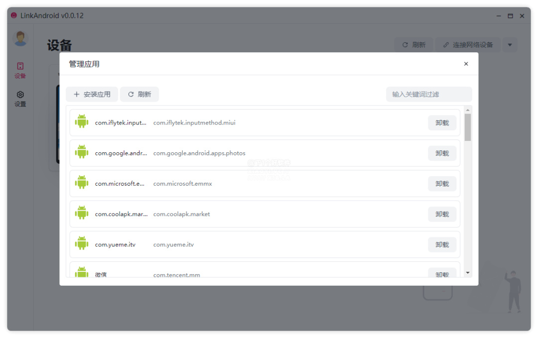 手機應用管理:支持在電腦上對手機安裝的應用進行卸載,支持關鍵詞過濾搜索,或者通過在電腦上傳輸應用包到手機上安裝。