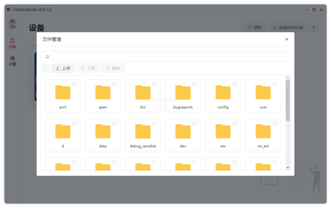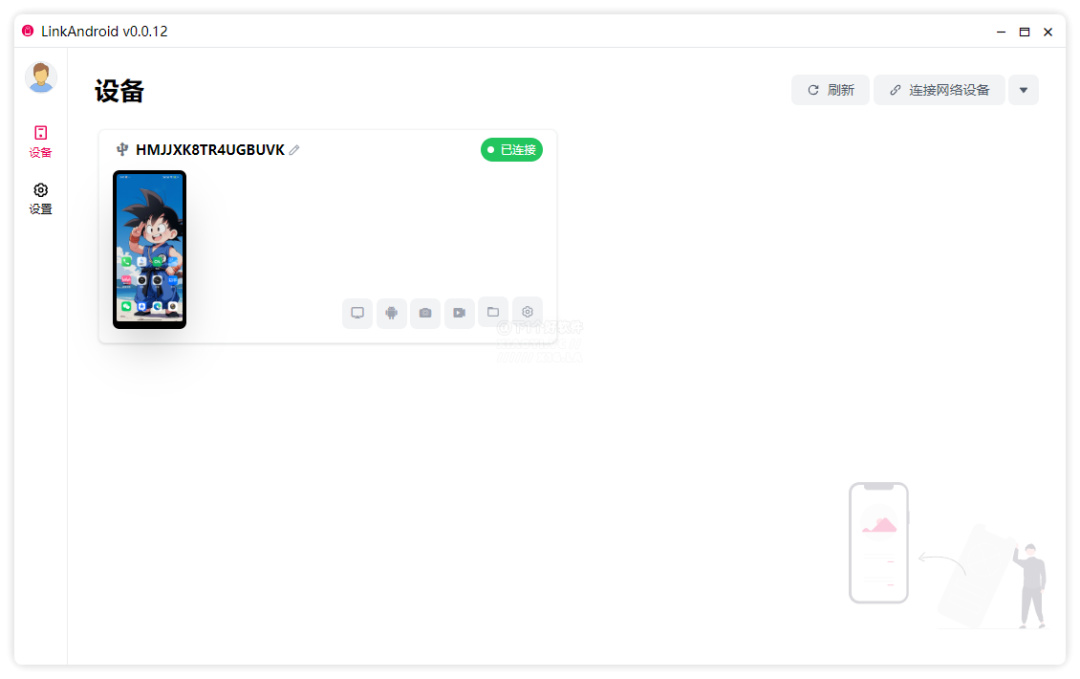 之後運行「LinkAndroid」軟件就會自動識別並添加你的手機,顯示已連接就表示成功了。如果需要通過網絡連接,點擊右上角連接網絡設備,輸入 IP 和端口即可。