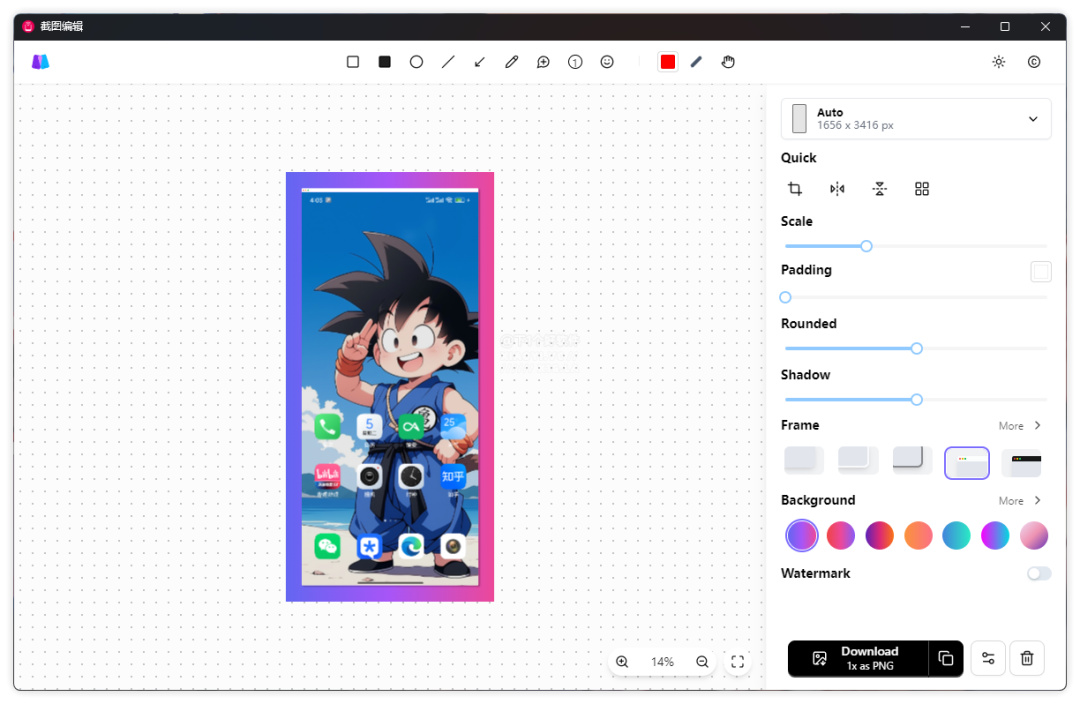 支持截屏:截屏後會自動打開截屏美化工具