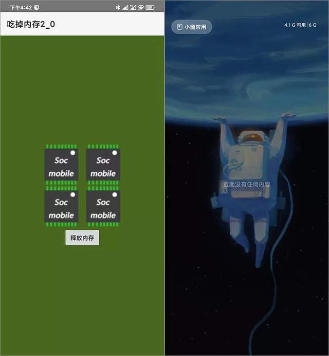 而这款「吃掉内存」就是这么的简单粗暴,运行后一键就能释放运存,经过雷锋测试,在只有 6G 运存的手机,自启的也就几个社交 APP,日常使用运存会剩余 2G 左右,多运行几个 APP 就明显运存吃紧,手机卡顿。