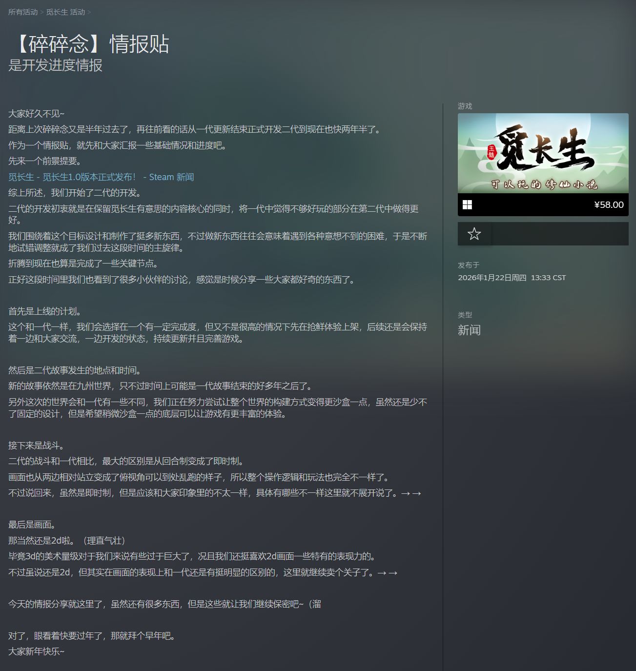 《觅长生2》依旧会选择在有一定完成度,但又不高的情况下以抢先体验版本上架,后续会持续更新并完善游戏内容