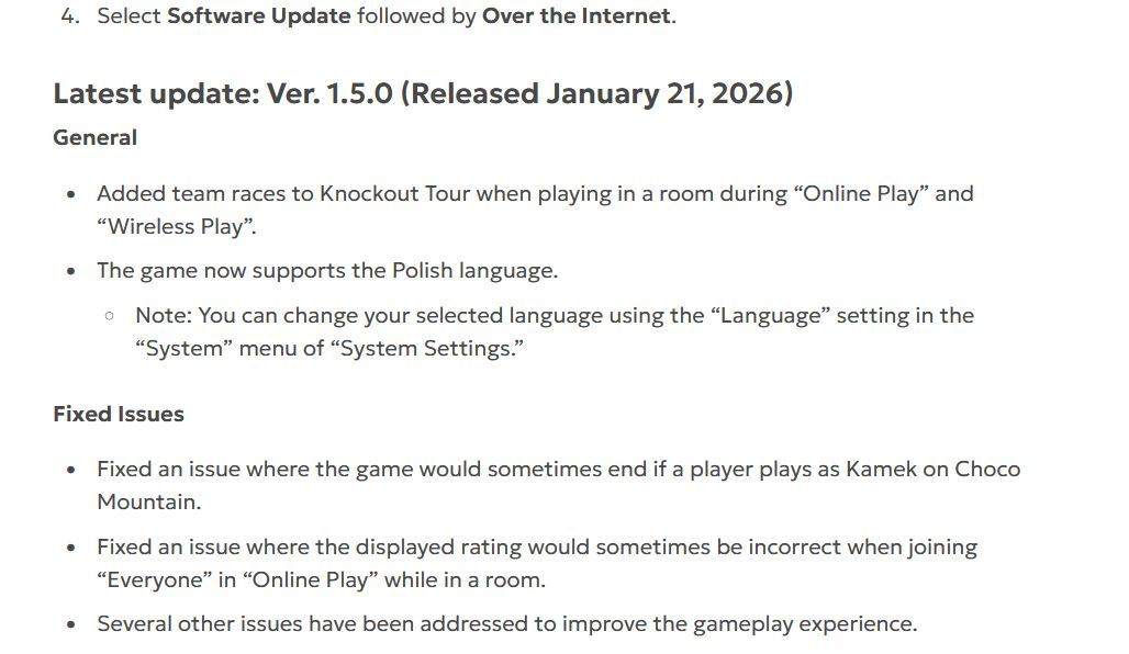 《马力欧卡丁车世界》1.5.0版本正式引入全新多人游戏功能与地区语言支持。本次更新通过在线游戏与无线联机房间中启用团队竞速功能,扩展了淘汰巡回赛玩法,为该模式注入全新竞技维度。