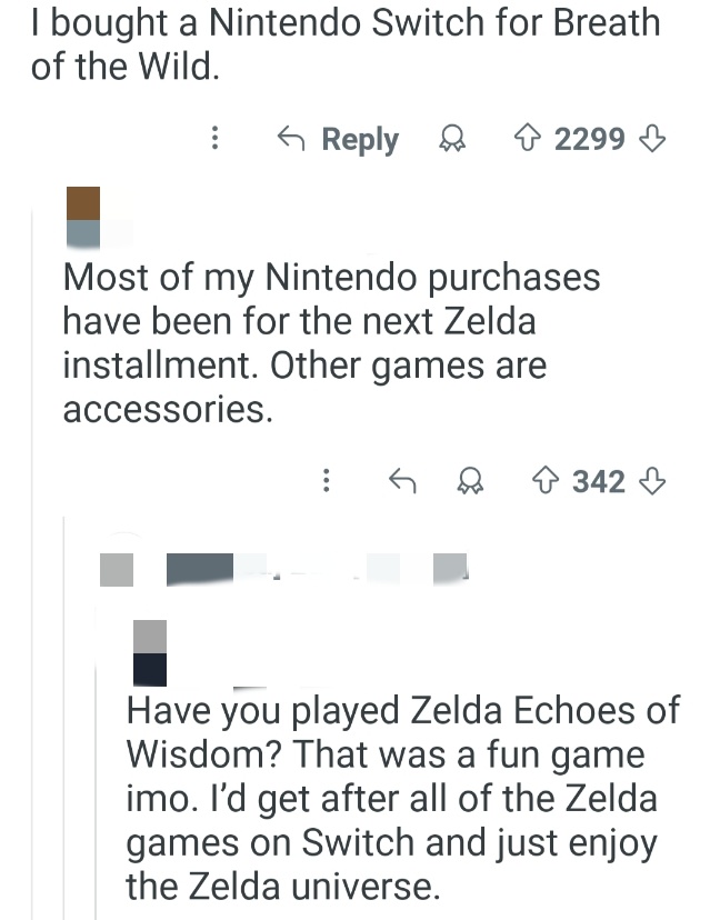 翻译:我大部分任天堂主机都是为了下一代塞尔达作品买的。其他游戏都是附加品。