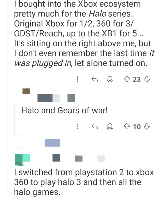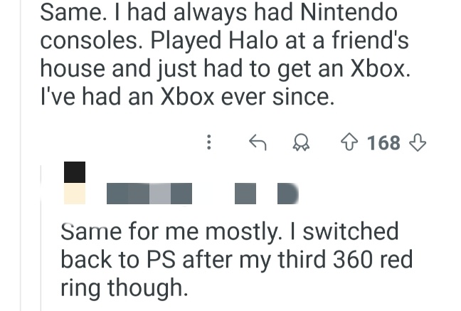 翻译:我也是。我一直都有任天堂的主机。在朋友家玩了《光环》之后,就非要买台Xbox不可。从那以后我就一直用Xbox了。