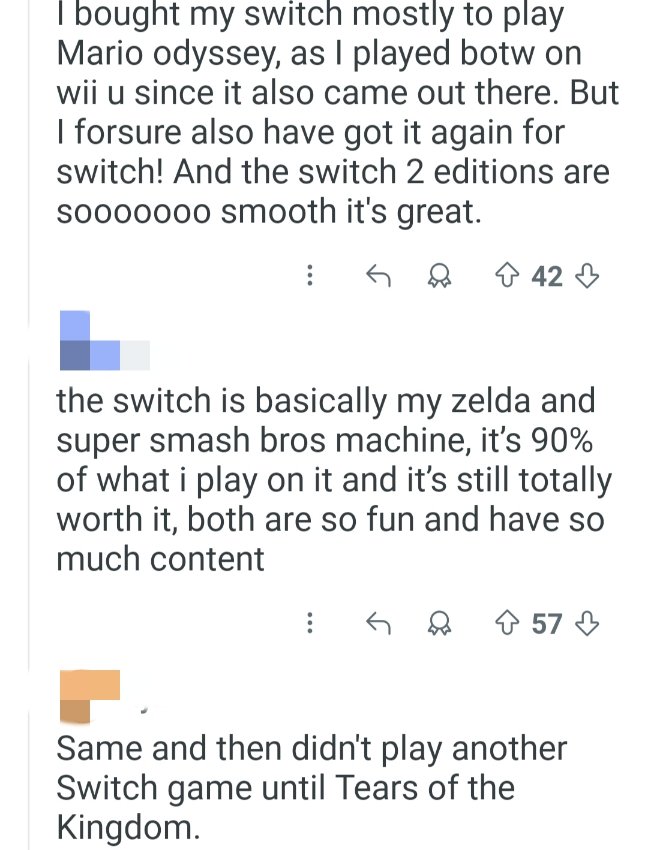 翻译:我买Switch主要是为了玩《超级马里奥:奥德赛》,因为《塞尔达传说:旷野之息》我也在Wii U上玩了(毕竟它也有Wii U版)。但我肯定也为Switch又买了一次!而且Switch 2版的画面流畅得不得了,太棒了。