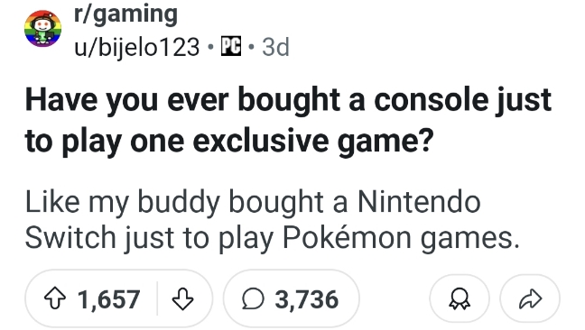 翻译:你是否曾经只为玩一款独占游戏而购买一台游戏机?比如我朋友买任天堂Switch就只是为了玩宝可梦游戏。