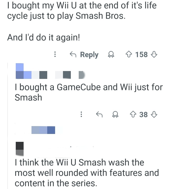 翻译:我在Wii U生命周期的末尾买了它,就为了玩《任天堂明星大乱斗》。而且我还会再买一次!