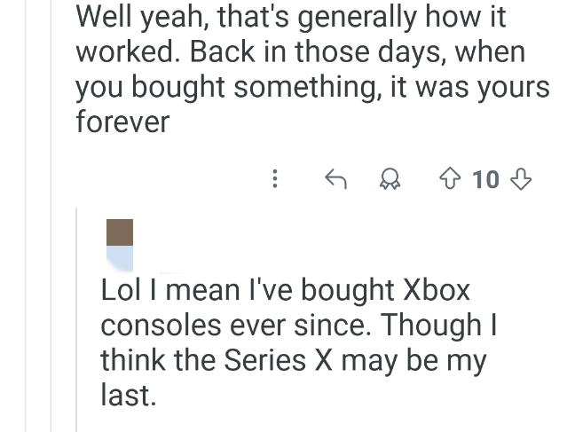 笑死,我是说从那以后我一直买Xbox主机。不过我觉得Xbox Series X可能就是我的最后一台了。