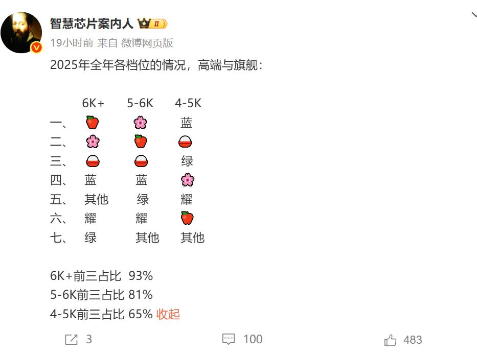 根据第三方博主“智慧芯片案内人”的数据,2025年6K以上高端手机,苹果第一,华为第二,小米第三,和上一年的排名一致。6K以上价位,苹果+华为+小米的市场份额高达93%,看起来小米还不错,但实际情况是,苹果+华为接近90%,小米虽然排第三,但断层式落后于苹果和华为,至于其他国产品牌,比小米的市场份额都还低,基本属于忽略不计了。