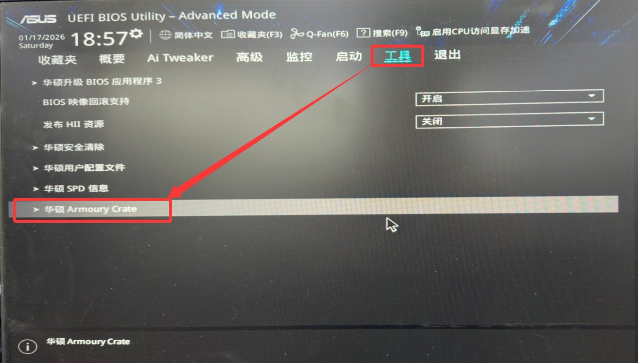 2.進入BIOS後,將語言設置爲中文,然後選擇“工具”大類中的“華碩ArmouryCrate”進入。【BIOS 初始界面多爲簡易模式,按下鍵盤上的F7 鍵,即可切換到高級模式,方便找到奧創相關設置選項】