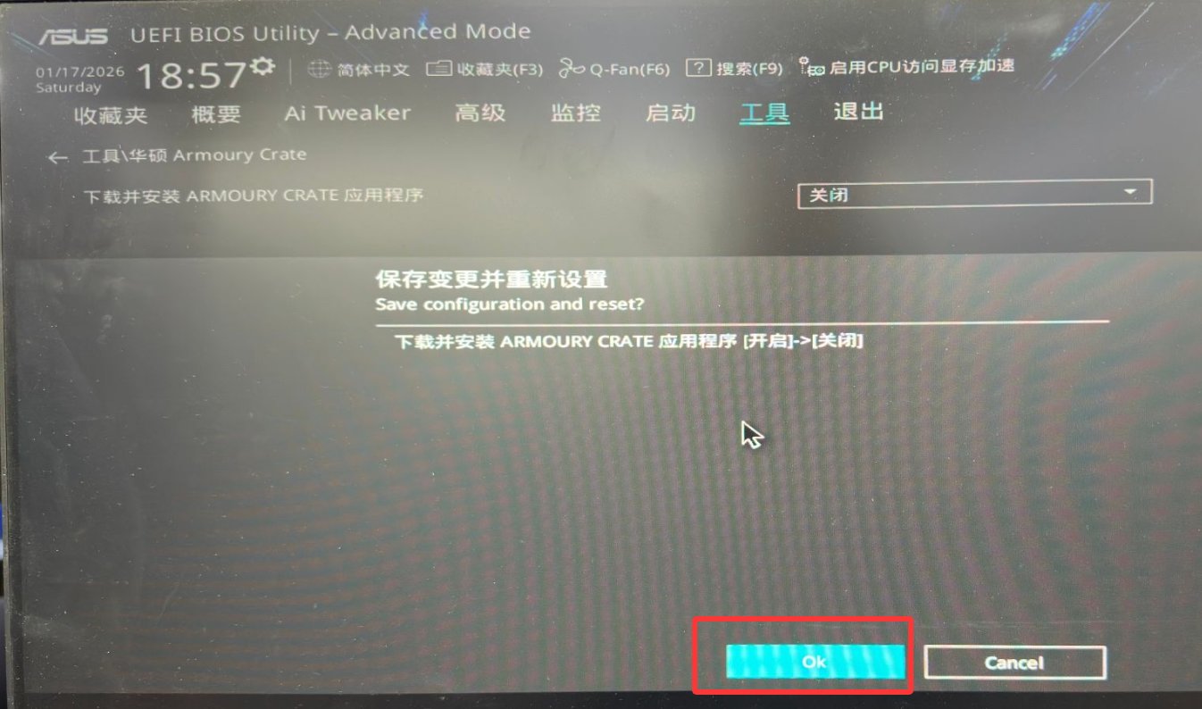 3.選擇下圖所圈的“下載並安裝ARMOURY CRATE應用程序”選項,在彈出的選項中選擇“關閉”。然後按一下鍵盤的F10鍵。